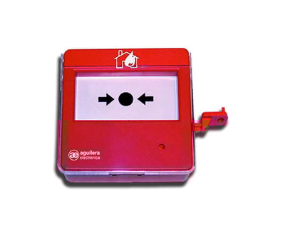 Unidad microprocesada direccionable de Aguilera Electrónica, fabricada según norma UNE EN 54-11. Controla un interruptor que al ser presionado a través de una lámina flexible (que queda enclavada sin que rompa), genera una señal de alarma en la central.
