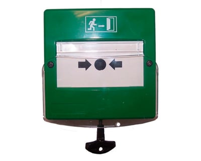 Pulsador de evacuación de Aguilera Electrónica, diseñado para su instalación en salidas de emergencia. Color verde. Uso interior. Equipado con microrruptor, sistema de comprobación con llave de rearme, tapa de protección de metacrilato transparente, contactos normalmente abierto NA, común C y normalmente cerrado NC y lámina de plástico calibrada para que se enclave y no rompa. Ubicado en caja ABS de 98X98X50 mm.