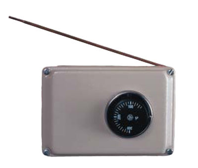 Sonda térmica AE97/STM de Aguilera Electrónica. Formada por sonda térmica de 3 metros que cierra un contacto a una temperatura seleccionada, selector de temperatura con escala entre 0 y 300 ºC, resistencia de 1 K. para evitar el cortocircuito cuando entra en alarma y resistencia final de línea para su conexión a un bucle controlado de una central de detección de incendios. Mecanizada en caja metálica de fijación mural con orificios para salida de sonda y entrada de cables. Medidas 160x110x70 mm. Alimentación 24 Vcc. Consumo en alarma 20 mA.