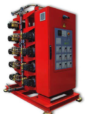 Equipo de bombeo compuesto por electrobombas de tipo volumétrico de pistones cerámicos de caudal 40L/min, presión 140 bar, motor eléctrico trifásico de 230/400 V y 15 C.V (11.04 kW) cada una, más una bomba centrífuga de acero inoxidable de caudal 24 m3/h y potencia de 2 CV, suficiente para el abastecimiento de 10 bombas. La presión de alimentación estará asegurada por esta bomba de cebado a 4 bar. El equipo se completa con una bomba jockey con caudal 2.6 l/min regulada a una presión entre 30 y 40 bar, con motor eléctrico trifásico de 380 V y 2 C.V. El cuadro de control eléctrico que regula el funcionamiento de los equipos está diseñado según la norma UNE 23500 y permite la emisión de alarmas a distancia. El equipo está compuesto por una bomba controlada por un variador de frecuencia y las otras a través de arrancadores suaves. Se entrega montado sobre bancada universal, regulado de acuerdo a la presión de trabajo según proyecto y comprobado su funcionamiento.