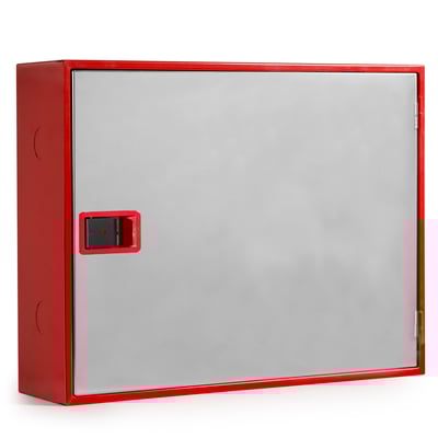 Armario horizontal construido en chapa de acero de 1 mm de espesor, pintado en color rojo RAL 3000, de medidas 640 x 500 x 160 mm, con puerta semiciega inoxidable y cerradura de apertura fácil, provisto de pretaladro para la entrada de alimentación, manguera, lanza, válvula de asiento y manómetro.
