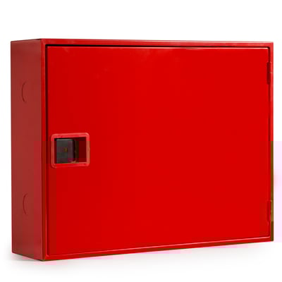 Armario horizontal construido en chapa de acero de 1 mm de espesor, pintado en color rojo RAL 3000, de medidas 640 x 500 x 160 mm, con puerta semiciega inoxidable y cerradura de apertura fácil, provisto de pretaladro para la entrada de alimentación, manguera, lanza, válvula de asiento y manómetro.