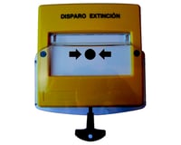 Pulsador de Aguilera Electrónica, diseñado según norma EN12094-3 para bloquear el disparo de un sistema de extinción. Color azul. Uso interior. Serigrafiado con el texto PARO EXTINCIÓN. Equipado con microrruptor, sistema de comprobación con llave de rearme, tapa de protección de metacrilato transparente, contactos normalmente abierto NA, común C y normalmente cerrado NC y lámina de plástico calibrada para que se enclave y no rompa. Ubicado en caja ABS de 98X98X50 mm.