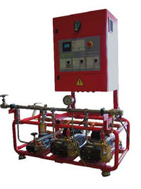 Equipo de bombeo de Aguilera Electrónica compuesto por electro bombas de tipo volumétrico de pistones cerámicos de caudal 40L/min, presión 140 bar, motor eléctrico trifásico de 220/380V y 15 C.V (11.04 kW) más una bomba jockey con caudal 2.6 l/min regulada a una presión entre 30 y 40 bar, con motor eléctrico trifásico de 380 V y 3 C.V (2,2 kW). El cuadro de control eléctrico que regula el funcionamiento de los equipos está diseñado según la norma UNE 23500 y permite la emisión de alarmas a distancia. El equipo está compuesto por una bomba controlada por un variador de frecuencia y la otra a través de un arrancador suave. Se entrega montado sobre bancada universal, regulado de acuerdo a la presión de trabajo según proyecto y comprobado su funcionamiento.