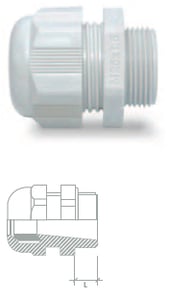 Prensaestopas con sistema de cierre por diafragma, referencia 21040007 de Pemsa. con junta de NBR y un índice de protección de IP68 (5 bar) según EN 60529. Disponible en rosca métrica de M12 a M63 y en rosca PG 7 a PG48 para diversos diámetros de cable. Certificación UL Classified. Fabricado en poliamida 6 autoextinguible en color gris claro RAL 7035, gris RAL 7001 y en color negro RAL 9005.