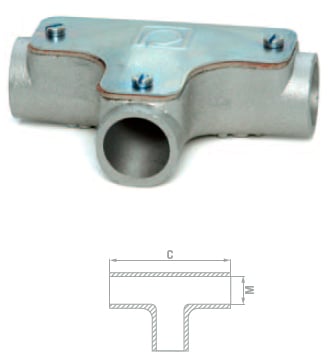 Derivación en forma de T enchufable con tapa registrable para la conexión de tubos RL en instalaciones que requieran elevadas prestaciones mecánicas y una resistencia media a la corrosión. Con un índice de protección IP54. Accesorio para crear una bifurcación en la conducción del tubo. Fabricado en aluminio y disponible en diversos diámetros.