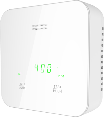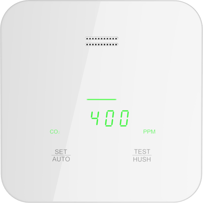 Detector de gran precisión capaz de medir la concentración de CO² en ambientes interiores, así como la humedad y temperatura, y emitir una señal de alarma luminosa y de voz cuando los valores alcanzan los preestablecidos por el usuario.