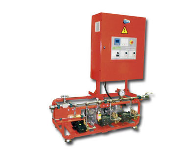 Equipo de bombeo compuesto por electro bombas de tipo volumétrico de pistones cerámicos de caudal 40L/min, presión 140 bar, motor eléctrico trifásico de 220/380V y 15 C.V (11.04 kW) más una bomba jockey con caudal 2.6 l/min regulada a una presión entre 30 y 40 bar, con motor eléctrico trifásico de 380 V y 3 C.V (2,2 kW). El cuadro de control eléctrico que regula el funcionamiento de los equipos está diseñado según la norma UNE 23500 y permite la emisión de alarmas a distancia. El equipo está compuesto por una bomba controlada por un variador de frecuencia y la otra a través de un arrancador suave. Se entrega montado sobre bancada universal, regulado de acuerdo a la presión de trabajo según proyecto y comprobado su funcionamiento.