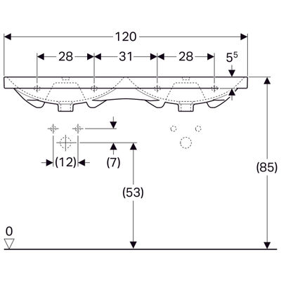 Lavabo de dos senos Geberit Acanto: 120x48cm, Toma de grifo=Centro, Rebosadero=Visible, Blanco