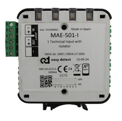 indicador de estado con visualización 180º. Regletas extraíbles individuales. Instalación en carril DIN o plano con posibilidad de incorporar caja ONE-BOX o SIX-BOX. Permite realizar la instalación sin polaridad en los modelos no aislados. Color blanco y negro. Dimensiones 92 x 105 x 22 mm. Certificado CPR EN54-18.