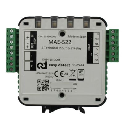 Módulo analógico de entradas y salidas. Dispone de entradas técnicas supervisadas para la selección de visualización en panel de la señalización de estado de equipos con conexión de un contacto NC o NA y de salidas de relé que proporciona un contacto C, NA, NC no reseteable. Con protocolo de comunicación