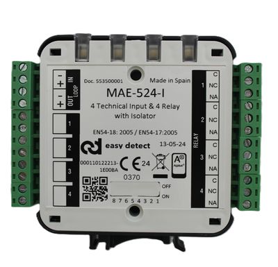 Módulo analógico de entradas y salidas. Dispone de entradas técnicas supervisadas para la selección de visualización en panel de la señalización de estado de equipos con conexión de un contacto NC o NA y de salidas de relé que proporciona un contacto C, NA, NC no reseteable. Con protocolo de comunicación