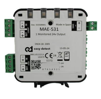 Módulo analógico de control de salida de 24V supervisados, para equipos que requieran alimentación a 24Vcc y señalización óptico-acústicas, discriminando la avería de corte o cortocircuito en dicha línea. Requiere alimentación auxiliar 24Vcc ocupando una dirección por salida en el lazo. Con protocolo de