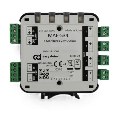 Módulo analógico de control de salida de 24V supervisados, para equipos que requieran alimentación a 24Vcc y señalización óptico-acústicas, discriminando la avería de corte o cortocircuito en dicha línea. Requiere alimentación auxiliar 24Vcc ocupando una dirección por salida en el lazo. Con protocolo de