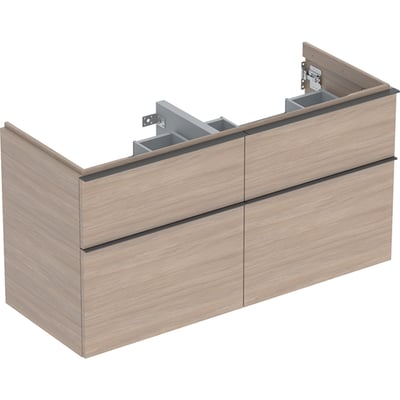 Mueble bajo Geberit serie iCon para lavabo de dos senos, con cuatro cajones: Ancho de lavabo=120cm, H=61.5cm, Cuerpo y frontal: encina/melamina con textura de madera, Tirador: lava/con pintura polvo al horno mate
