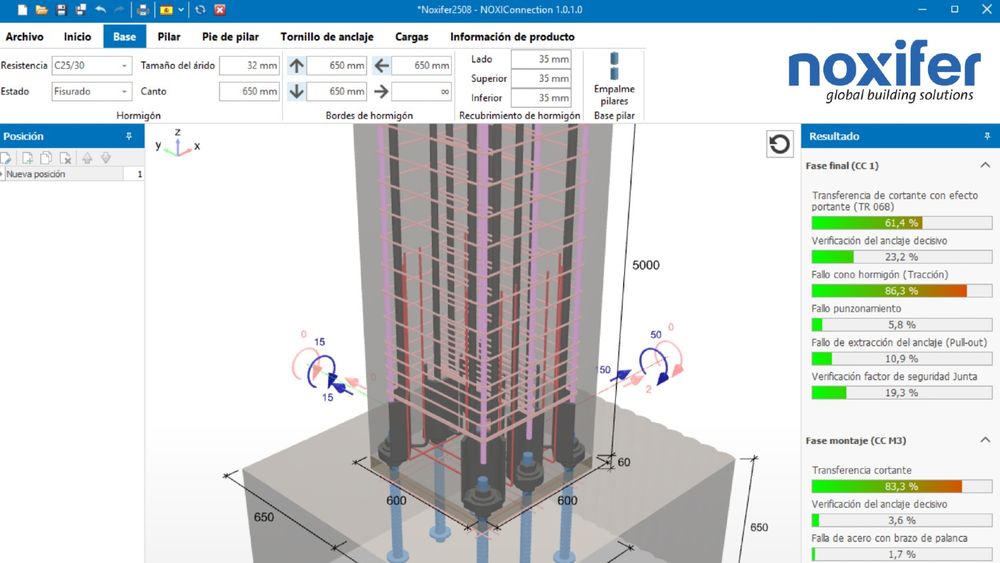 Uno de los puntos destacados de este software es que, en un solo proyecto, el usuario puede crear las diferentes disposiciones de los pies de pilar para luego utilizarlos y validarlos en sus distintos casos de carga, reduciendo el tiempo de gestión y aprovechando al máximo la información introducida por proyecto. También ofrece la posibilidad de seleccionar la capacidad 36 del pie de pilar NOXI, único en el mercado, optimizando las conexiones que antes se dimensionaban con el modelo 39.