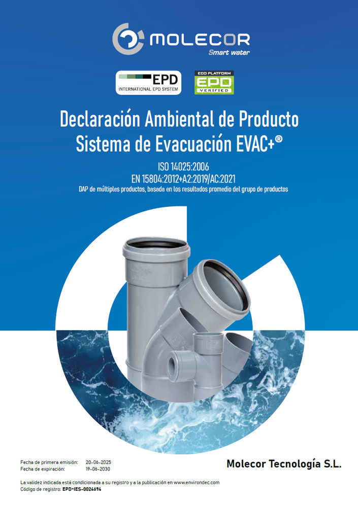EVAC+® , un sistema de evacuación doméstica desarrollado por la compañía para edificación. Esta Declaración Ambiental se une a las ya obtenida para el Sistema de Evacuación Insonorizada AR®, las Tuberías TOM® y accesorios ecoFITTOM® en PVC Orientado, el Sistema de saneamiento corrugado SANECOR® y la tubería para riego TR6®.