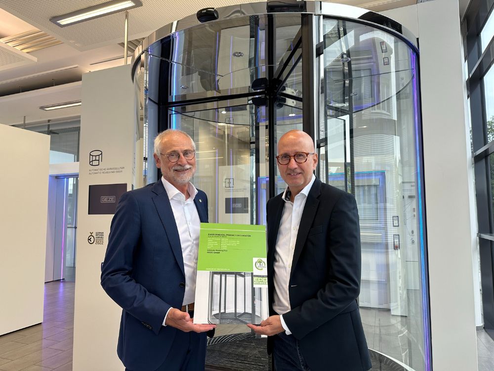 Hans Peters, presidente del consejo de administración de la IBU, entrega el EPD para todas las puertas giratorias GEZE a Peter Rürup, jefe del equipo de gestión de productos estándar de GEZE. © GEZE GmbH La sostenibilidad en toda la gama de productos es una cuestión fundamental para