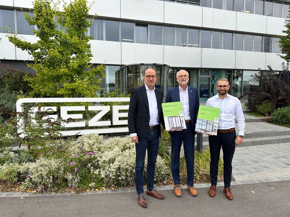 esfuerzos de GEZE en materia de sostenibilidad en sus productos: Planificar y modernizar edificios sostenibles El Sr. Peters, de la IBU, entrega a Peter Rürup y Daniel Stauche las EPD para las puertas correderas automáticas y las puertas giratorias automáticas © GEZE GmbH