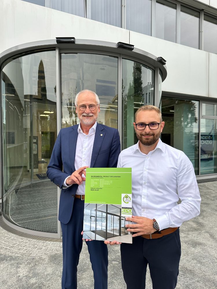 Hans Peters, presidente del consejo de administración de la IBU, entrega el EPD para todas las puertas giratorias GEZE a Daniel Stauche, directos de producto de puertas correderas en GEZE. © GEZE GmbH Requisitos para certificados de Green Building Declaración ambiental del producto del Instituto de Construcción y Medio Ambiente (IBU) © GEZE GmbH Para arquitectos, constructores y planificadores, la eficiencia energética de los edificios desempeña un papel cada vez más importante. Una EPD (Environmental Product Declaration) o declaración de producto medioambiental recoge datos detallados de impacto medioambiental sobre materias primas, consumo energético, emisiones y otros impactos medioambientales, y proporciona una base fiable para tomar decisiones sostenibles, desde la licitación hasta la operación del edificio. Con las declaraciones de sus productos más vendidos,