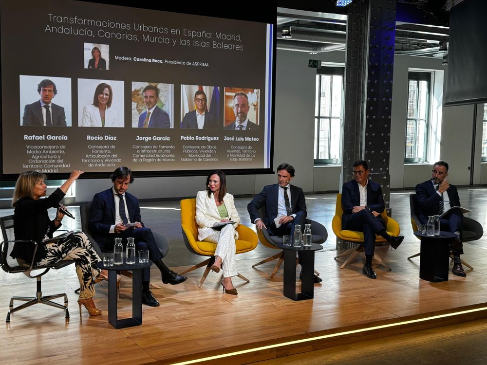 Transformaciones urbanas en España: Madrid, Andalucía, Canarias, Murcia y las Islas Baleares, ha sido moderada por Carolina Roca, presidenta de ASPRIMA, y ha contado con la participación de Rafael García González, Viceconsejero de Medio Ambiente, Agricultura e Interior de la Comunidad de Madrid; Rocío Díaz Jiménez, consejera de Fomento, Articulación del Territorio y Vivienda de Andalucía; Jorge García Montoro, consejero de Fomento e Infraestructuras Comunidad Autónoma de la Región de Murcia; José Luis Mateo Hernández, consejero de Vivienda, Territorio y Movilidad de las Islas Baleares, y Pablo Rodríguez Valido, consejero de Obras Públicas, Vivienda y Movilidad del Gobierno de Canarias.