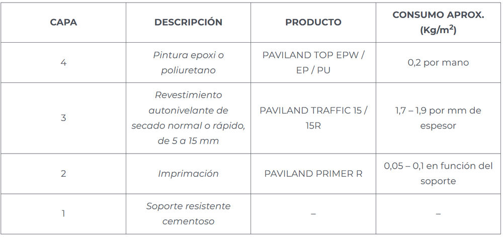 PROCEDIMIENTO DE APLICACIÓN El SISTEMA PAVILAND TRAFFIC dispone de tres capas: una capa de imprimación para asegurar la adherencia con el soporte existente, la capa principal resistente compuesta por un revestimiento autonivelante y una pintura superficial de terminación, sellado y protección.