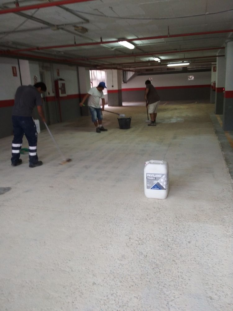 Primera fase de trabajo Después de una correcta preparación del soporte y previa aplicación de la imprimación PAVILAND PRIMER R, dejando pasar un mínimo de 1 hora y un máximo de 24 horas, aplicamos el autonivelante cementoso PAVILAND TRAFFIC 15 R con un espesor mínimo de 1cm.