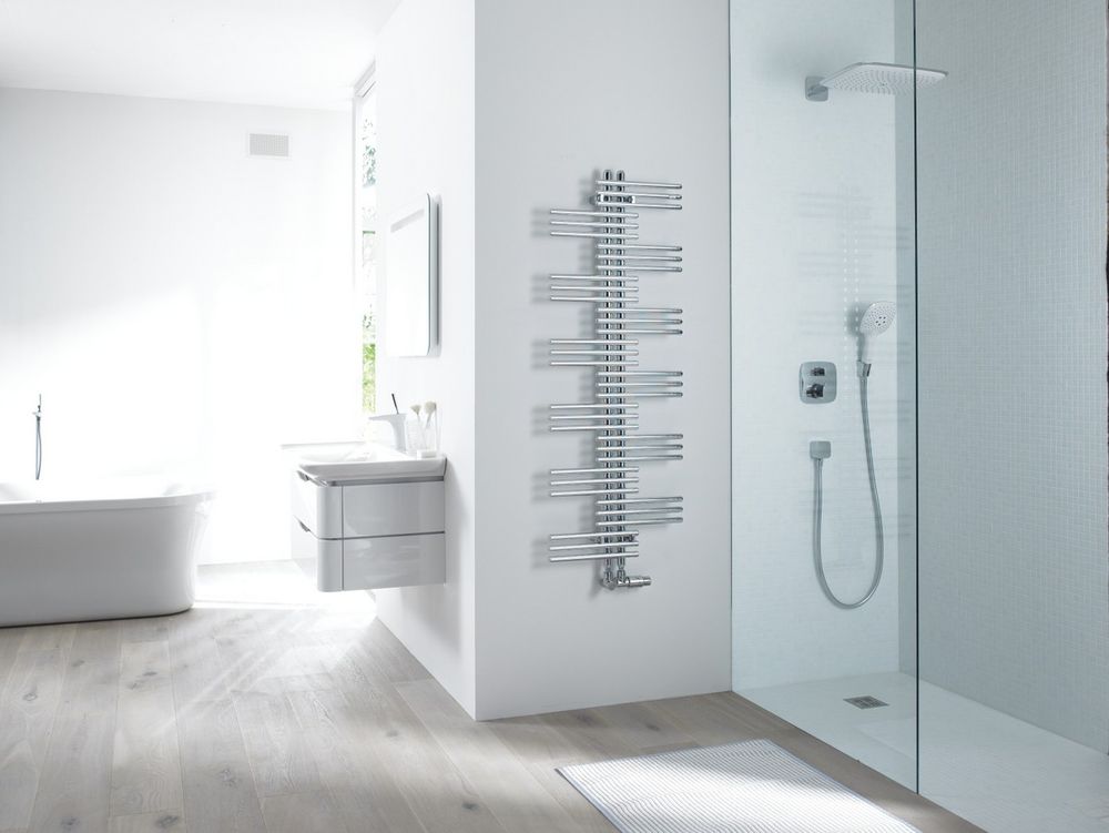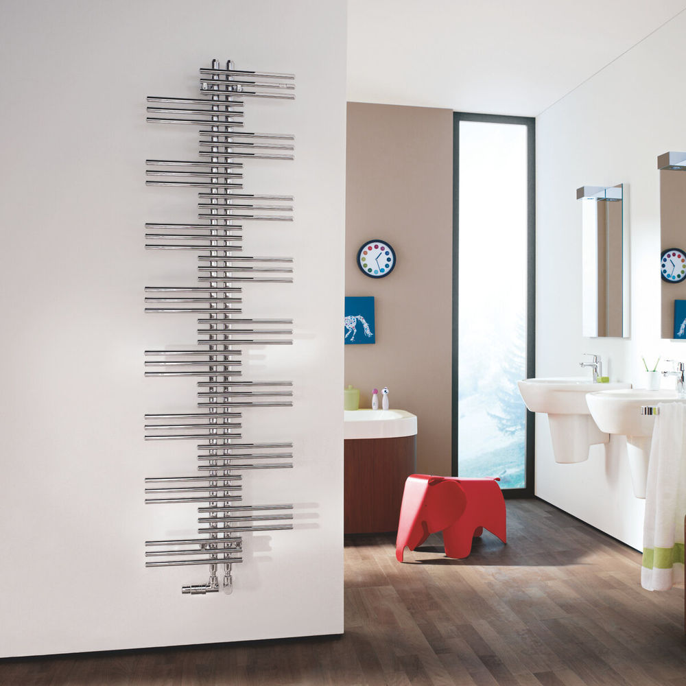 Zehnder Yucca, la originalidad en "forma de palmera". La disposición simétrica y abierta hacia los lados de los tubos redondos es perfecta para colgar las toallas, los albornoces o la ropa. El radiador se caracteriza por una baja profundidad y una estética transparente. Disponible en casi todos los colores y superficies de la carta de colores de Zehnder.