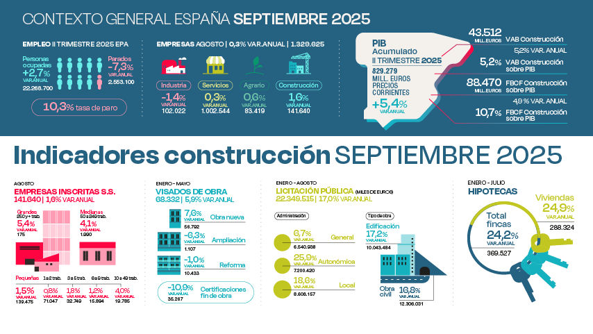 El Observatorio Industrial de la Construcción de la Fundación Laboral de la Construcción analiza, en su última infografía de ‘ Cifras del sector de la construcción en septiembre de 2025’, los principales indicadores del sector al cierre del tercer trimestre. Los datos reflejan la buena marcha del sector, con una evolución positiva en magnitudes clave como la afiliación y la actividad empresarial.