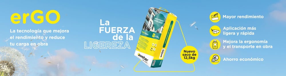 Gracias a la tecnología erGO, el nuevo mortero permite instalar más metros con menos esfuerzo, agilizar los tiempos de aplicación y reducir el número de palets necesarios en obra, garantizando un fácil manejo y un acabado más fino, lo que hace que la puesta en obra sea más rápida y cómoda. Además, webertherm BASE erGO se aplica igual que cualquier mortero SATE de Weber, pero con la ventaja de que es aproximadamente un 50% más ligero que un mortero tradicional, lo que disminuye de forma notable el esfuerzo requerido tanto en la mezcla como en la extensión.
