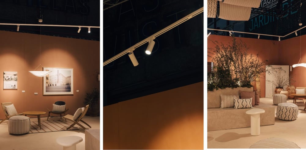la iluminación desarrollada por Simon no se limita a resolver técnicamente el espacio, sino que construye escenas. A través de una luz envolvente y matizada, se subrayan las texturas de la arcilla, las vetas del banco escultórico central de Neolith y las capas textiles que estructuran el ambiente, reforzando la sensación de refugio y calma que define el concepto KASBAH. La luz acompaña el recorrido y modula la experiencia, generando zonas más íntimas y otras abiertas al intercambio.