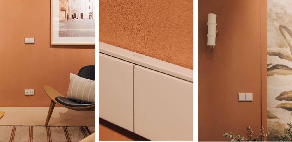 la serie Simon 360 se integró en acabado mate arena , una elección que dialoga con los tonos terracota y beige del espacio, favoreciendo la continuidad visual de las superficies y una lectura limpia y ordenada del conjunto.