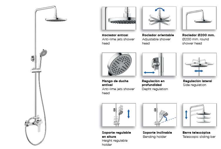 Detalle de la nueva Columna de Ducha Monomando Extensible con Kit de Genebre y de sus diferentes funciones Basik, una gama básica al completo La