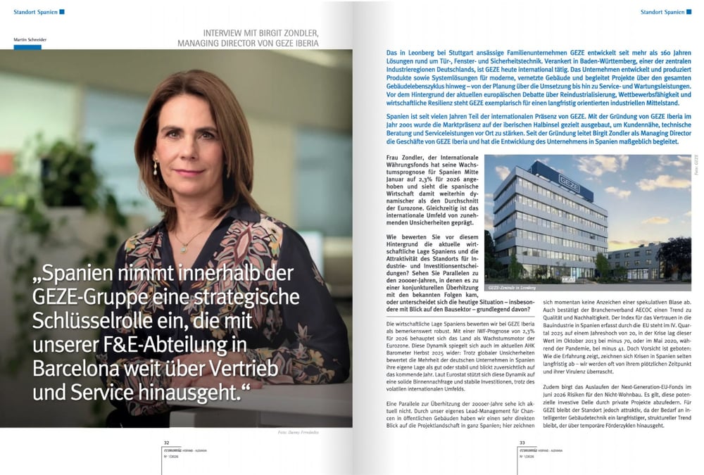 Bajo el título "Los (indispensables) deberes para la industrialización del siglo XXI", la revista de la AHK dedica su edición de febrero de 2026 a analizar la competitividad y resiliencia del tejido empresarial hispano-alemán. Birgit Zondler, quien lidera GEZE Iberia desde su fundación en 2001, analiza cómo la compañía ha logrado consolidarse como un referente en sistemas de puertas, ventanas y seguridad en la península ibérica.