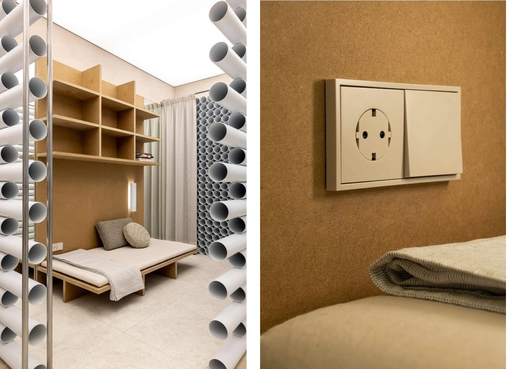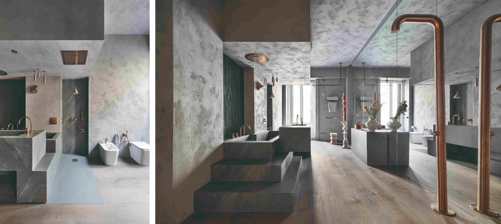 Lo invisible de Zooco Para el espacio de Geberit, Zooco Studio propone una instalación que revela la arquitectura que permanece tras los muros, sustituyendo el tabique por una estructura ligera que expone las instalaciones. En esta lectura técnica del espacio,