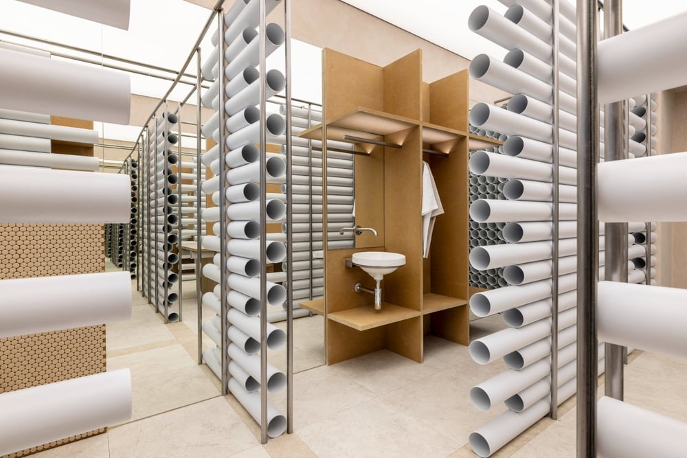 El equipo de Zooco, formado por los arquitectos Sixto Martín, Miguel Crespo y Javier Guzmán, propone en esta ocasión un proyecto que pone en valor los elementos esenciales que suelen quedar ocultos. El espacio sustituye el tabique tradicional por una estructura ligera de tubos que deja a la vista el sistema circulatorio del edificio. Se trata de un espacio conceptual que se convierte en fuente de inspiración para descubrir la esencia de las instalaciones de agua y cómo se expresan, por delante de la pared del baño, con elementos del mejor diseño y la tecnología más innovadora como el inodoro bidé AquaClean Alba o el pulsador ultrafino Sigma40.