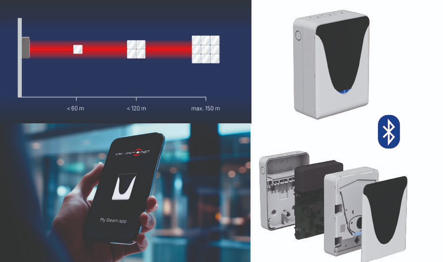 Uno de los principales diferenciales del DLF150 es su puesta en marcha sencilla e intuitiva. El alineado del sistema se realiza mediante Bluetooth con la aplicación My Beam, compatible con dispositivos iOS y Android, que permite una visualización clara y precisa del proceso de ajuste. Esta funcionalidad reduce de forma notable los tiempos de instalación y facilita la intervención técnica incluso en proyectos complejos. El detector incorpora además LEDs de estado en el frontal y una ranura para puntero láser como apoyo adicional durante la alineación.