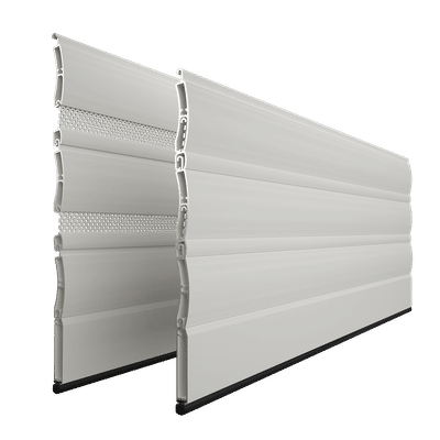Persiana enrollable de aluminio extrusionado, PM-49 microperforada de Saxun. Espesor nominal: 9,27 mm