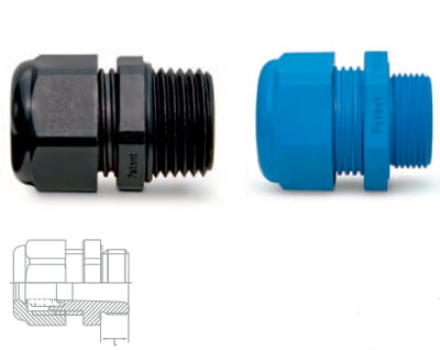 Prensaestopas con sistema de cierre por diafragma mejorado con junta de NBR y un índice de protección de IP68 (10 bar) según EN 60529. Disponible en rosca métrica de M12 a M63 y en rosca PG 7 a PG48 para diversos diámetros de cable. Fabricado en poliamida 6 autoextinguible en color azul RAL 5012, (Consultar disponibilidad en color negro RAL 9005). Aplicaciones ATEX con atmósferas explosivas.