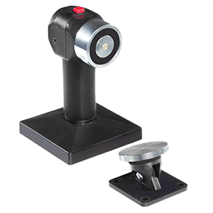Retenedor de suelo de color negro para puertas corta-fuego 50 Kg. 24V 60 mA, incluye rótula ajustable.
