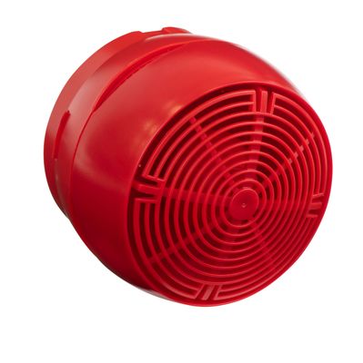 Sirena de bajo consumo. Tonos y volumen configurables (32 tonos y 3 volúmenes) Potencia acústica 95 dBA, dependiendo del tono seleccionado. Color rojo IP33. Certificado CPR EN 54-3. Dimensiones: 109 x 84 mm