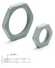 Tuerca de poliamida 6 libre de halógenos con rosca métrica y rosca PG y en varios colores, gris (RAL 7035), gris oscuro (RAL 7001) y negro (RAL 9005) para conexión de racores y elementos roscados de sistemas de tubos plásticos, rígidos, corrugados y flexibles.