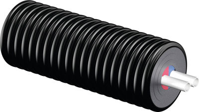 Tubería DOBLE para canalización de agua de calefacción, marca Uponor, modelo ECOFLEX Thermo Twin, de polietileno reticulado de alta densidad (PEX-a), con reticulación conforme al método Engel (grado de reticulación >70%), de 32 mm de diámetro exterior y 2,9 mm de espesor de pared y cumpliendo la norma UNE EN ISO 15875, con barrera plástica externa Eval (etilvinil-alcohol) antidifusión de oxígeno, según norma EN 1264-4, preaislada térmicamente con espuma de PE reticulado de celda cerrada de 38 mm de espesor, conductividad térmica 0,0401 W/m·K según DIN 52612 y absorción de agua <1% por volumen, pérdidas de calor controladas por DIN Certco, protección mecánica con tubo envolvente corrugado de PE-HD de 175 mm de diámetro y 2,1 mm de espesor, para una temperatura de funcionamiento de 80 °C (máximo 95 °C) a 6 bar . Medida la longitud instalada. Cód.1018135